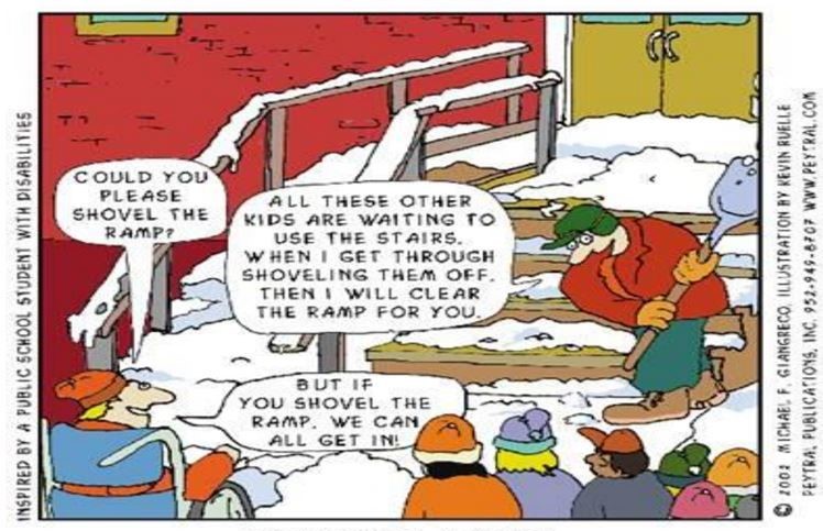 There are a lot of hot topics in today’s educational world. One of which is how to incorporate educational technology into the classroom. There is a comic strip that has been out for quite awhile that depicts a man shoveling snow off of the stairs. He leaves it on the ramp and the people there are quite upset. The caption reads something to the effect of that if you pave the road for special needs learners you pace the road for all learners. I find this extremely profound and important because the same is true in the classroom. There is a famous quote that’s out there. I wish I knew who it was from but I don’t but it is very profound. If learning materials are not accessible for all learners, then the learner’s abilities are not accessible to the educator. If you think about that a few minutes it is extremely profound because it talks about how we need get to know our learners. Roblyer and Doering talk about this in their text. They talk about two ways to do this through remediation and compensation. With remediation we are helping our learners perfect a craft. Maybe through therapy or through some other means but there’s a craft that they are already gaining ground and then we are just helping them improve it. Another way is through compensation. This is basically a way to accommodate difficulties to help their performance. Sometimes it is through high tech options, low tech options, or even no options at all. All these options are extremely important, but the only way we can use them effectively is if we get to know our learner in the classroom. So, dive down, get deep with your students. Learn your students and search out the different ways you can help your learners strive to be better. One of the ways you can do this is to go to the ISTE conferences or to some other educational technology conference so that you can be familiar with the technology that is out there in today’s world and help your students become more successful.